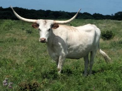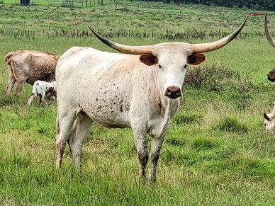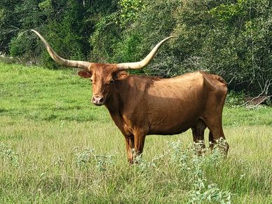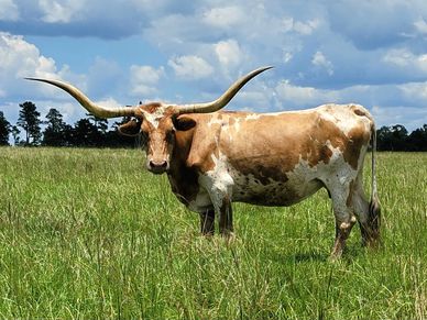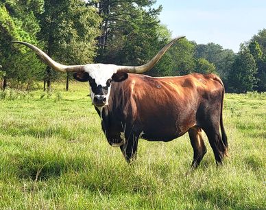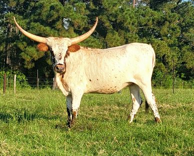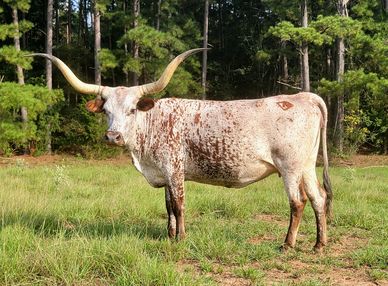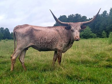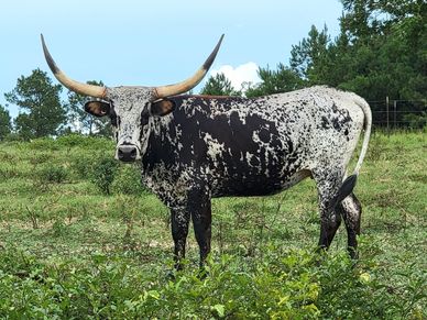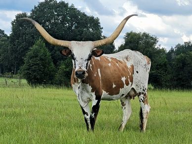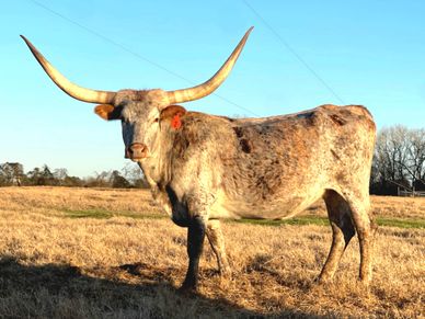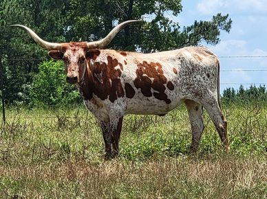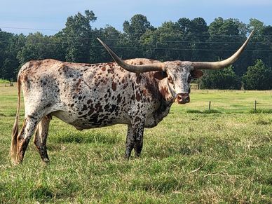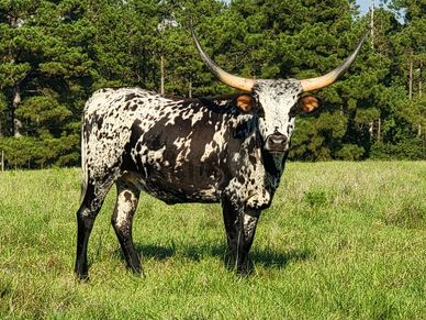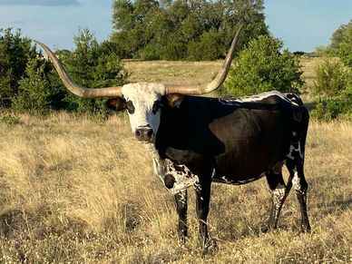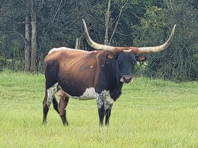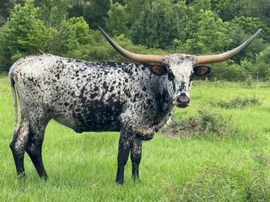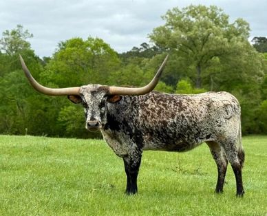 This beautiful speckled cow is co-owned with our dear friends Rick & Sharon Wotherspoon. They live on the coast and have no place for cattle but love the Texas Longhorn breed, so we formed a partnership. Rose has a pedigree that goes back to the foundation cattle of Ace Cattle Company which were the foundation for Terry Moore's herd.