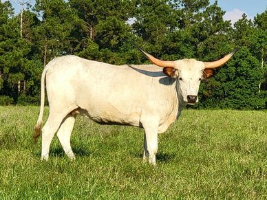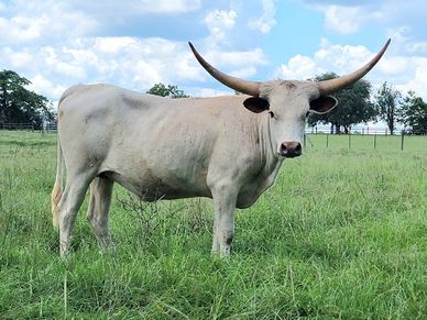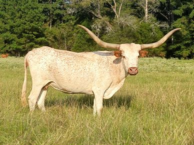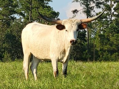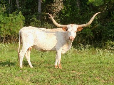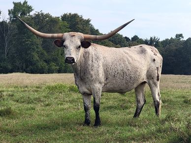 This beautiful female is one of three clones of the legendary cow, Little Ace Swamp Guinea. Making this cow a genetic daughter of the great Ace's Mojo and the awesome Delta Rockette. We are honored to co-own this great female with Falls Creek Longhorns.